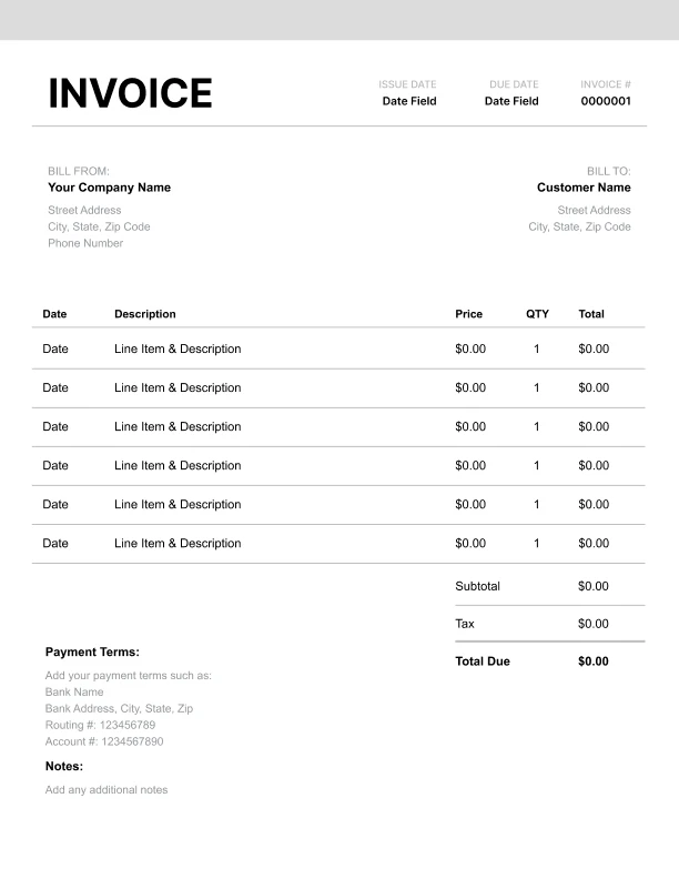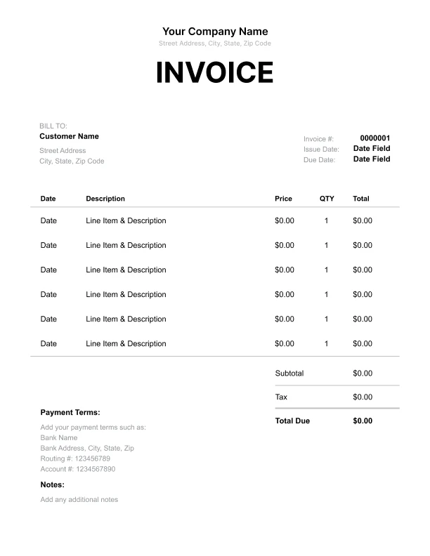 Itemize flight time, labor, editing, mileage, and deliverables with professional invoice line items.