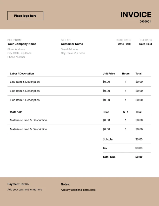 Free invoice templates for general contractors built for materials, labor, and change orders. Download and edit in PDF, Word, Excel, Google Docs, or Google Sheets.