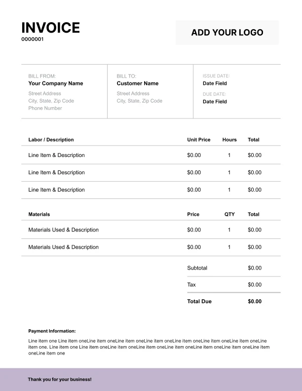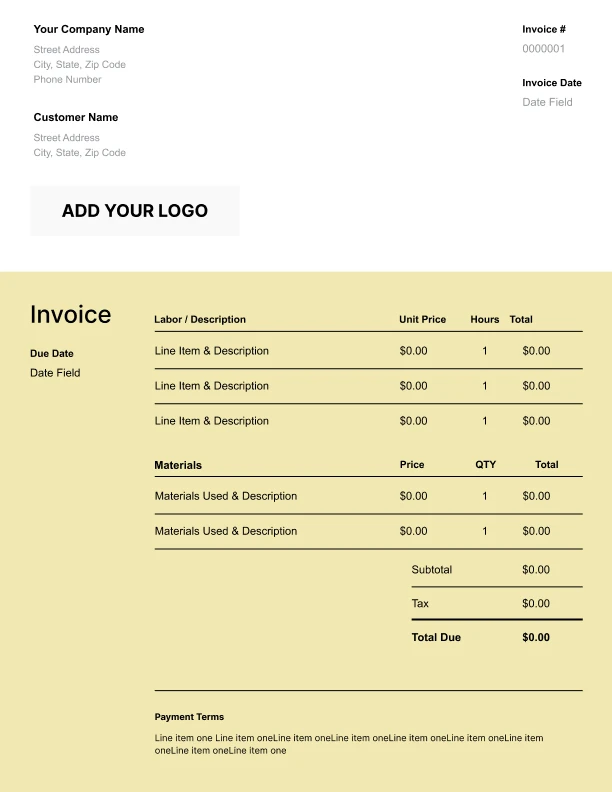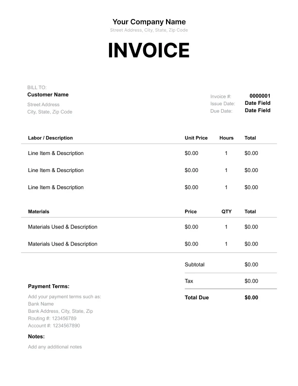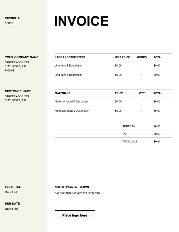 Free invoice templates for Interior Designers built for design hours, furniture and decor, and purchasing fees. Download and edit in PDF, Word, Excel, Google Docs, or Google Sheets.