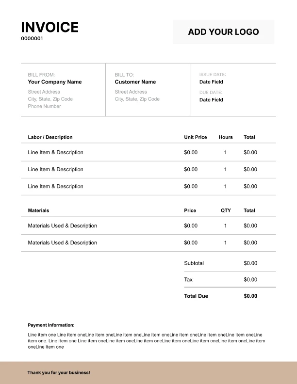Free invoice templates for landscapers built for parts and labor, materials, and disposal fees. Download and edit in PDF, Word, Excel, Google Docs, or Google Sheets.