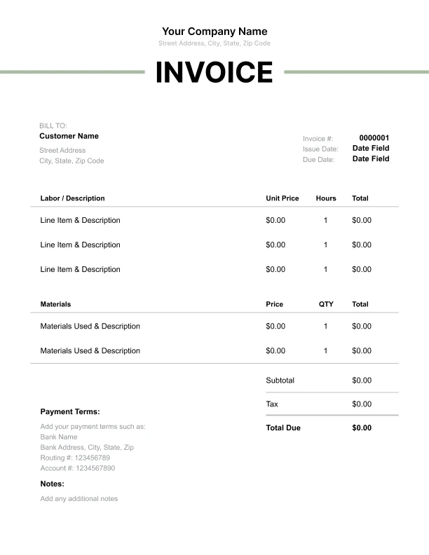 Free invoice templates for mold remediators built for labor, materials, and equipment charges. Download and edit in PDF, Word, Excel, Google Docs, or Google Sheets.