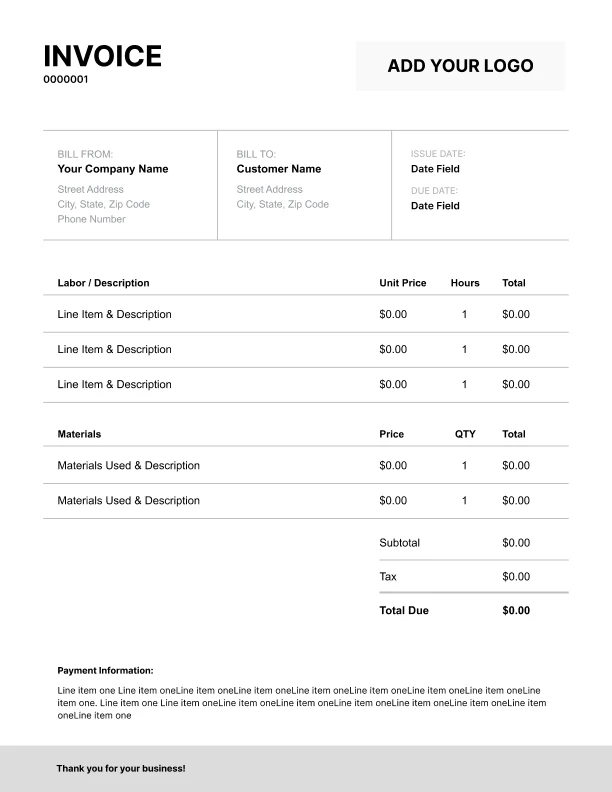 List labor, cable type, jacks, patch panels, labeling, testing, and firestopping. Add racks, ladder tray, and waste haul if used. Example: “48-port patch panel $165, ladder tray install 4 hrs @ $95/hr.” Use our Network Cabling Invoice Template to keep these consistent.