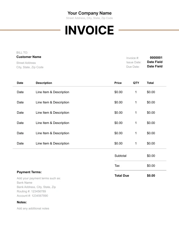 Free invoice templates for pet boarding businesses built for nightly rates, additional pet charges, and medication fees. Download and edit in PDF, Word, Excel, Google Docs, or Google Sheets.