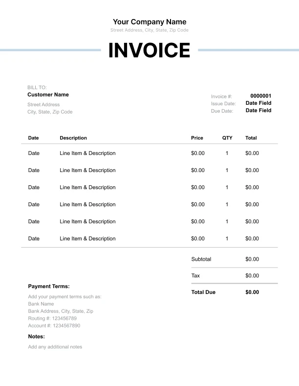 Free invoice templates for psychiatrists built for session fees, medication management, and copays and deductibles. Download and edit in PDF, Word, Excel, Google Docs, or Google Sheets.