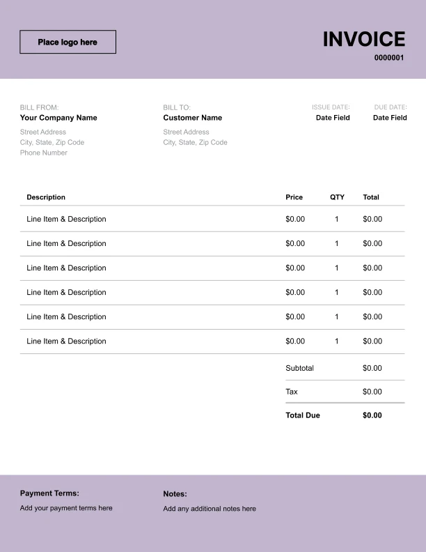 Itemize products, quantities, unit prices, discounts, and taxes with professional invoice line items.