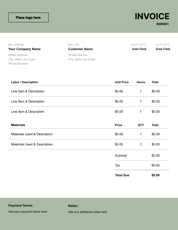 Free invoice templates for Solar Installers built for parts and labor, permits, and interconnection fees. Download and edit in PDF, Word, Excel, Google Docs, or Google Sheets.